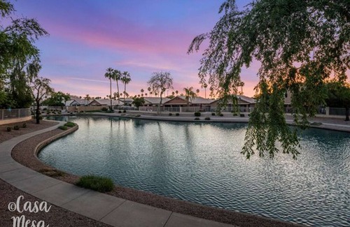 Sit on the back patio and watch the sunsets over the adjacent lake, and soak up the sunshine in this lovely Phoenix east valley home. This home-away-from-home is in the Superstition Springs area of Mesa, and is fully appointed and professionally designed for your comfort and enjoyment. Walk to the nearby movie theatre, or try out the many restaurants and shops nearby.