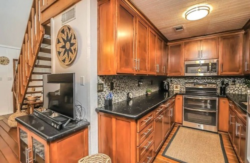 Downstairs includes two bedrooms, a full bathroom, a dining area for six, and a fully stocked kitchen with complimentary coffee, cooking spices, and pantry essentials. Upstairs, you'll find another bedroom, a half bath, and two flex spaces—one with a futon, the other with kids’ games and activities for rainy-day fun. A washer and dryer are available for added convenience.