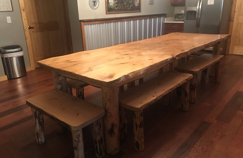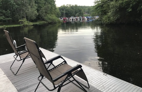 Camp Parker has 3 bedrooms, which sleeps 10 with all the comforts of home. Relax in your open living room with three reclining couches in front of the 65" Smart TV. All the furnishings and beds are new. Make a meal in your large eat in kitchen with a 10' hand crafted live edge table from the trees harvested on the property. Look closely at the table. An outline of our lake is burned into it. Appliances are all new stainless steel. Fully stocked kitchen with plenty of dishes, silverware and pots/pans. There is even a clam pot! The outside large covered deck runs the whole length of the home with another 12' table outside with benches to fit the whole family. There is a BBQ grill for your grilling pleasure. This is a great hang out for rainy days. There is also a quiet sitting/relaxing area on the other side. Go down either of the two gated stairways to our private path to the lake. Hang out at the fire pit overlooking the lake in the Adirondack chairs or sit out on the dock in the sun. Bring your boat and tie up at our private dock for the week. The cove is wonderful for floating, kayaking or hanging out.