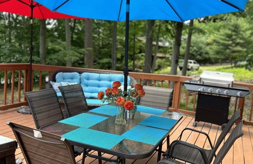 *overlooking the woods and beautiful Lake Wallenpaupack has private built in hot tub with gazebo( water in hot tub is always replace after each guests visit) , seating area, two lounges , table with chairs and umbrellas , gas grill ( we provide gas)