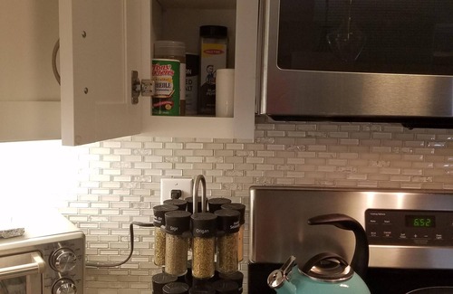 Our home has an open floor concept on the main level, and all of the furnishings are new. We have decided to share our food, spices, and cooking oils because it makes much more sense.