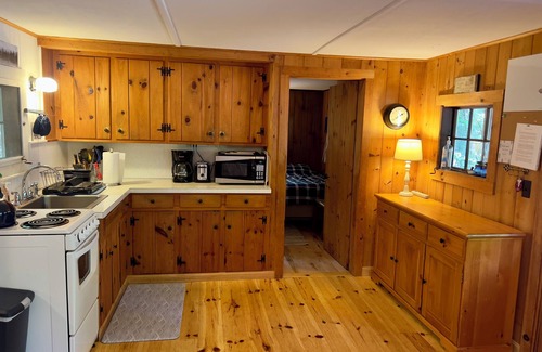 2-bedroom cottage at Deepwood Lodges with large sandy beach and use of small boats shared with 16 other cottages. This charming cottage has a room with a queen bed, and a 2nd bedroom with a full bed, and a set of bunk beds, perfect for a cozy getaway. With WiFi available, guests can stay connected while enjoying the peaceful surroundings.