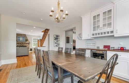 The kitchen is designed for preparing meals for a group. The Thermador stovetop and separate oven are a dream to use, and two dishwashers makes meal cleanup a breeze. Four dining areas inside the house and on the lakeside porch means the entire group can enjoy meals together. Gather in the cozy living room to watch TV from your own streaming accounts (sorry, the fireplace is off limits to guests). A convenient half bath completes the main level. On the second floor you’ll find four separate sleeping areas, including a primary bedroom with king bed and ensuite featuring an oversized shower, a second bedroom with a king bed, a third bedroom with a full bed and a twin, and a fourth bedroom with two twin beds. The three bedrooms share a large bathroom with double sinks, and a laundry room is convenient for all to use.