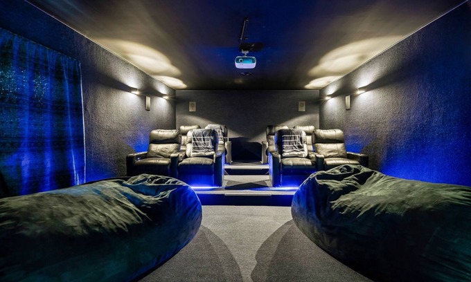 Featuring: 12 fully reclinable Italian leather seats, 2 huge bean bags (in front) for the kids, a huge screen, 8 wall mounted speakers, surround sound, 2 subwoofers (for deep base), carpeted walls and soundproof insulation.