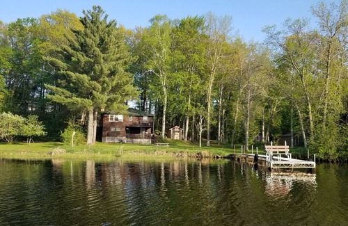 Lakefront cabin! Full kitchen, dining, living areas, 3BR, 2.5 baths, upper and lower decks, grill, firepit. Seasonal: private dock, rowboat, canoe, kayaks, SUP, paddleboat, swim platform, life vests (5 adult, 2 youth and 1 child.) Public boat launches nearby and park boat/PWC at dock during your stay. Free parking and WiFi ..Weekly only, Sat. to Sat mid-May through mid-September. *3-night min. rest of the year, please message for available check-in/out days *Pets: dogs only, non-aggressive, 2 max, must provide proof of rabies vaccination.