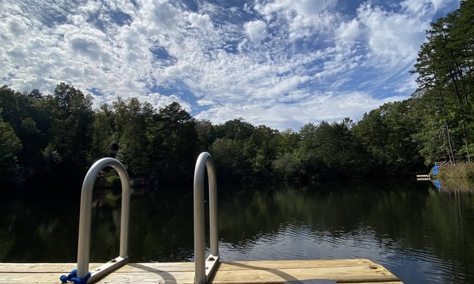 This perfect log sided cabin is nestled in the North Georgia Mountains just north of Blue Ridge, GA and Blue Ridge Lake. Take in views of the 4 acre spring-fed lake from 3 levels of outdoor space, the hot tub, outdoor bar, fire pit, two tier dock and fishing dock.