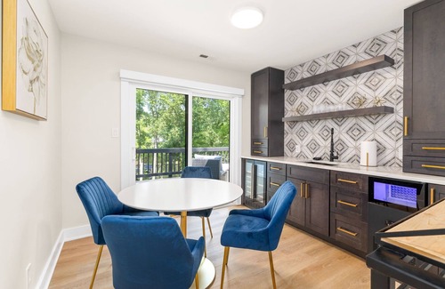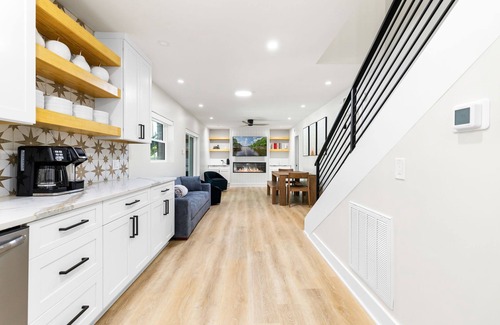 Main Level: Step inside to a bright, open living room with a large sectional (seats 7), two chairs, ottoman, a 65” Smart Insignia TV, and a fireplace for cozy nights. Two king bedrooms are on this floor. The first king bedroom overlooks the road and has a Smart TV, ceiling fan, dresser, closet, and nightstands with lamps. The second king bedroom offers deck access, Smart TV, ceiling fan, dresser, closet, and nightstands with lamps. The upstairs bathroom features two sinks, a toilet, and a spacious double shower. The garage on this level is set up as a game and utility space with a washer/dryer, small kitchenette area, wine fridge, ice maker, and sink, with access to the upper deck.