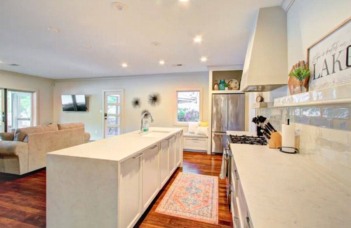 Open concept to Living Room, fully equipped, stainless steel appliances, cooking basics & spices, Coffee Bar with drip coffee maker & Keurig, toaster oven, blender, kitchen table seats 10