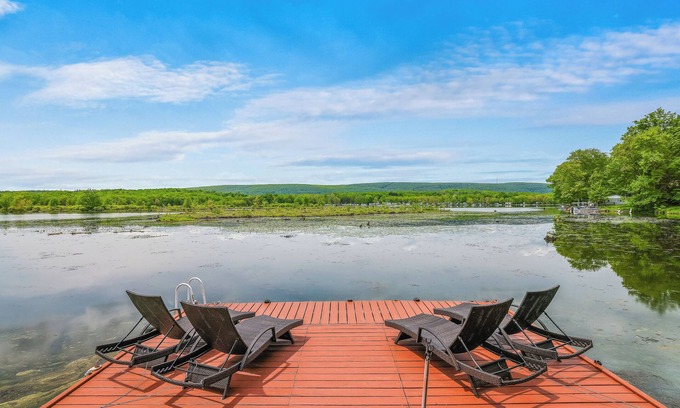 Lakefront A-Frame | Hot Tub, Dock, Kayaks, Games, Fire Pit, Fireplace, Deck, Patio, Amazing Views has 3 Bedrooms , 2 Bathrooms, and max occupancy of 9 people. The minimum rental for this property is 1 nights, but this can change depending on the season you plan on staying. Previous guests have rated it 2, and VRBO labeled it a top-rated House because of the excellent services rendered by the owner or manager of this House, and has consistently provided great experiences for their guests. Most families or guests that use it recommend it to their friends and some of them are repeat guests. House has a friendly neighborhood, and the Lake Ariel has interesting places to visit. If you want to learn more about the House in Lake Ariel, such as places to visit and things to do nearby, you can check below to learn more.