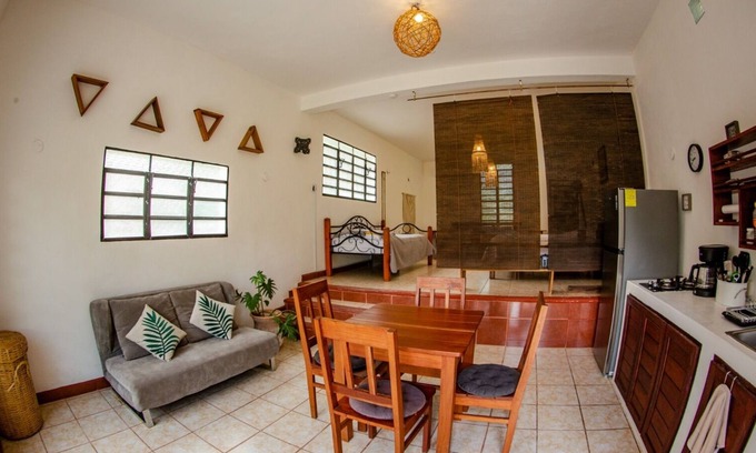With a king, queen & twin bed it is ideal for couples, families and groups of friends up to 5 people. It is equipped with a kitchenette, dining table, coat rack, two full bathrooms (one private, one shared) and a large garden with palapa, BBQ and direct access to the lagoon through our dock. Swim or explore the lagoon by kayak or sail boat, enjoy a good book in the shade of the impressive Pucté tree or just relax in the hammock!
