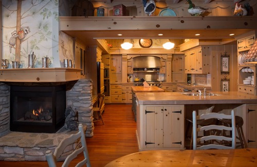 - Stunning lakehouse lodge with a deck, fireplace, lush patio & lake access