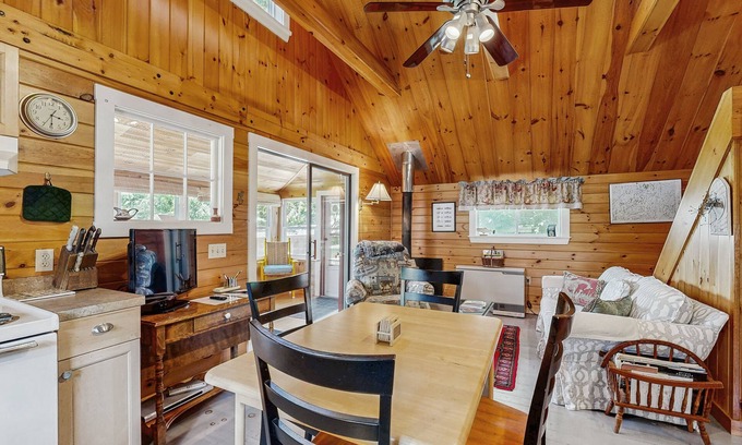 Inside, the cottage features a cozy downstairs bedroom, a loft bedroom, and a fun bunkroom designed for younger guests, ensuring everyone has a restful place to unwind after a day of exploration. Settle in for movie nights with Netflix or browse the DVD library, or gather around the outdoor firepit for s'mores and stories under the stars. The private gas grill is perfect for cooking up delicious meals as the sun sets over the water.