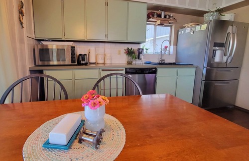 This home can comfortably sleep 4 people. There are two bedrooms each with a queen bed, plus an additional hideabed couch in the living room. Enjoy a beautiful view of the lake while you work from the desk in the front living room. One bathroom with tub shower and a designated laundry room with front load washer and dryer. This cabin also includes a designated room with workout equipment including a Peloton, rowing machine, and free weights. Enjoy star gazing from the porch at night. There is an extra large doggy door off the laundry room with a gated area in the back for your furry friends.
