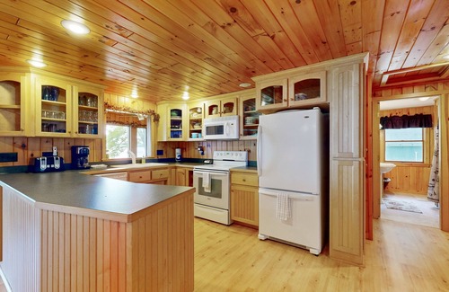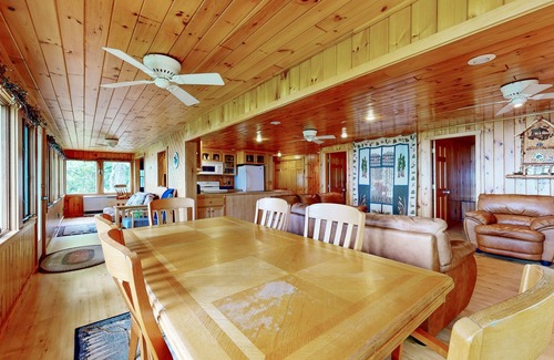 The interior is full of classic cabin atmosphere, from the wood paneling adorning the walls and ceilings to the decor and textiles inspired by the outdoors. There's ample space to gather and relax, including a living room with leather sofas, a family room with a TV, and a lakefront sunroom where you can dine as a family or escape with a good book. On summer days, sear your fresh catch on the gas grill outside. Come winter, cozy up with a favorite movie as the day's clothes spin in the washer/dryer.