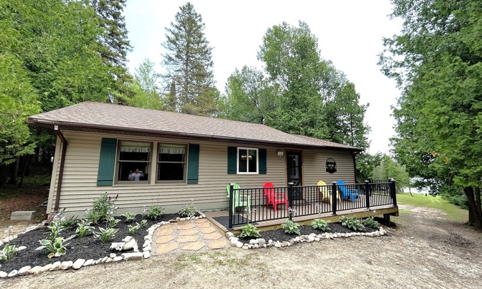 The U.P is full of snow, come visit this great trail house!New! Chain Lake Hideaway is a quaint 2-bedroom cabin perched above the north shore of Chain Lake. Located directly ON the trail system in St. Ignace, you can access the hundreds of miles of ATV trails veining through the U.P, just steps from the house. A snowmobiler or four-wheelers dream! Chain Lake Hideaway boasts an aromatic, open-concept knotty pine setting. In the first bedroom you will find a cozy queen size bed, one door over you will find bedroom #2 housing a full / twin-style bunk bed with lake views. When needed, you may use the queen hide a bed, or the travel crib! Take a short walk down to the water to enjoy sandy beachfront access, a fire pit, and a paddle boat, or sit on the deck and enjoy the peaceful, serene wooded surroundings which occasionally brings in wildlife! The Hideaway is just a short 5-minute drive to the downtown area, local amenities, and the Mackinac Island Ferries.