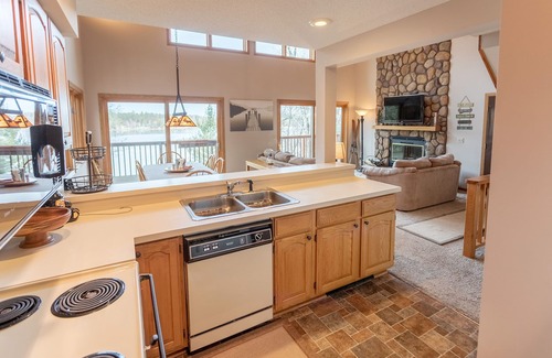 Step inside to a warm and inviting open-concept main level with a fully stocked kitchen, generous dining space, and a relaxing living room anchored by a stunning two-story stone wood-burning fireplace. You’ll also find a main-level bedroom with a comfortable queen-size bed. Upstairs, an oversized loft offers sweeping lake views, a plush king bed, a cozy reading/tv nook, and two futons—perfect for additional sleeping space or lounging. With plenty of storage and room to spread out, it’s an ideal spot for relaxing or sleeping. The lower level features a bunk room with twin beds, another queen-sized bed, second full bath, full laundry, and a comfy family room with a gas fireplace—ideal for movie nights or a kid-friendly retreat.