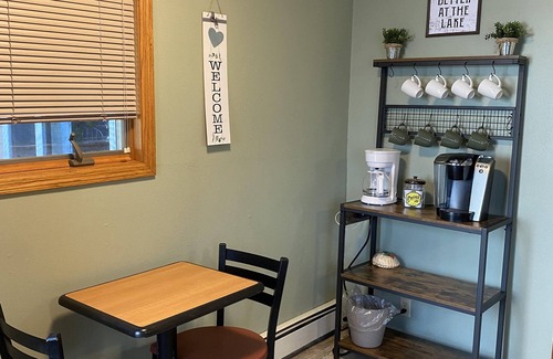 Complimentary items: Coffee, coffee creamer, body soap, kitchen soap, hand soaps, paper plates, plastic silverware, dog poop bags, cleaning products, fish cleaning area