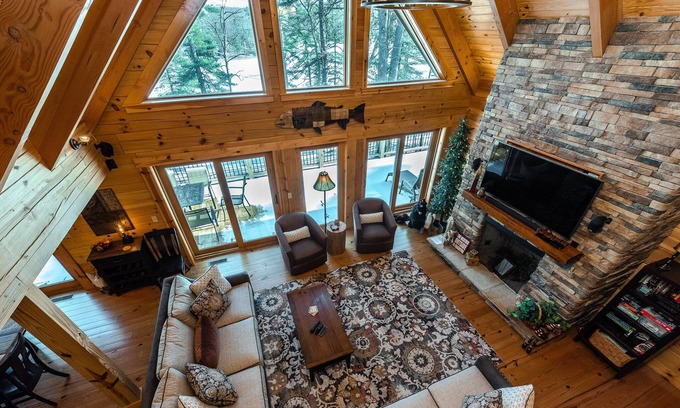 Curb appeal alert! The charm of this elegant lakefront home is hard to miss! With a large back deck and a beautifully furnished interior, your friends and family will feel right at home from the moment you step inside this warm and wonderful lake chalet. The main level of this home features a great room and kitchen that is just bursting with top of the line amenities, premier home furnishings, and modern upgrades. You’ll find the home’s lower level to be equally accommodating, with plenty of space for everyone, along with fun features like a wet bar and foosball table. The covered back porch- with an outdoor fireplace and plentiful seating- is the perfect spot to gather together to celebrate the close of day, the sun setting over still waters and your loved ones laughing by your side. Celebrate the best of lake life with a stay at Lake’ N Logs!
