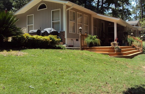 Southern lake charm perfect for a romantic escape, family fun or holiday gathering. **Available for long-term rental. *Pets allowed with prior approval. Quiet cove with level walk to water and view of main lake. Boat dock, built-in picnic tables, charcoal grill, and fire pit available along with two accessible kayaks. 45 minutes to Ft. Benning. 30 minutes to beautiful Providence Canyon. Shopping, restaurants & boat launch just minutes away. Big yard for fun and games. Main bedroom suite has big picture windows with Jacuzzi tub for relaxation. WIFI available. Three bedrooms with beds includes a king, queen, and double bed (no sleeper sofas). Two full baths.