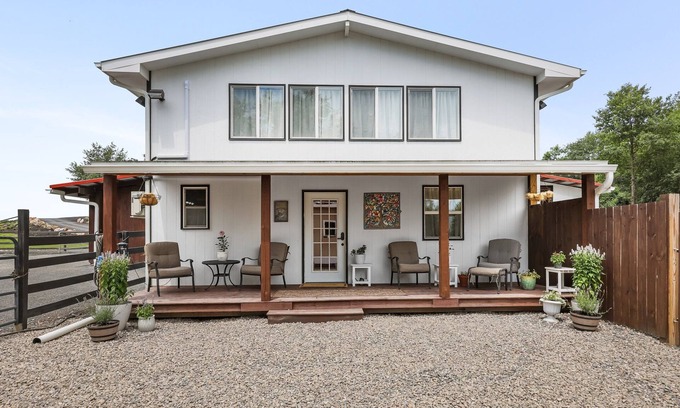 The guest cottage is tucked behind the barn with its own fenced-in courtyard. Wake to lake views and horses grazing, sip coffee on the covered porch, stroll the gardens, swim, float, and grill by the lake. End the day under the stars by the firepit or head into town for dinner & cocktails.