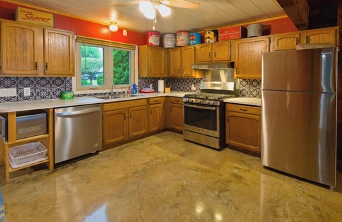 Reviewers say it again and again--this property checks all the boxes. Waterfront? Check. Watercraft, Fireplace inside, firepit by the lake, hot tub, lightning quick Wi-Fi, full kitchen, laundry, ample free parking, easy self check-in? Check, check, and check to all that, and much more.