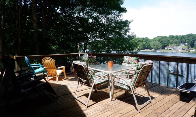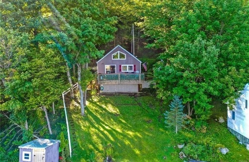 Cozy seasonal camp on Pleasant Lake! 1 bedroom on main floor and second bedroom in the loft area that currently fits 5 beds! Gorgeous view over the lake from loft bedroom! Wonderful front deck overlooking the lake. New 30' deck with ladder added to retention wall on waterfront, perfect for sunbathing and swimming!