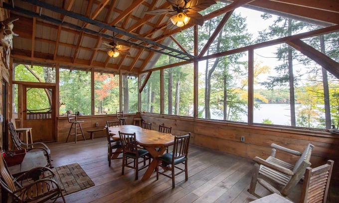 Lakeside Cottage is a spacious and rustic lodge, perched on a hillside overlooking Wild Goose Pond. It features two stories and a huge screened porch overlooking the lake. Located on a nature preserve, guests have full access to the lake, canoes, kayaks, firepit, and 300 acres of woods and trails. Upstairs, there is one small bedroom with a full bed, a large bedroom with two full-sized beds and a twin bed, and a full bathroom. Downstairs, a fully equipped kitchen connects to an open layout dining and living room. A first-floor master bedroom has a queen-sized bed with access to the screened porch. Another full bathroom is located on the main level.