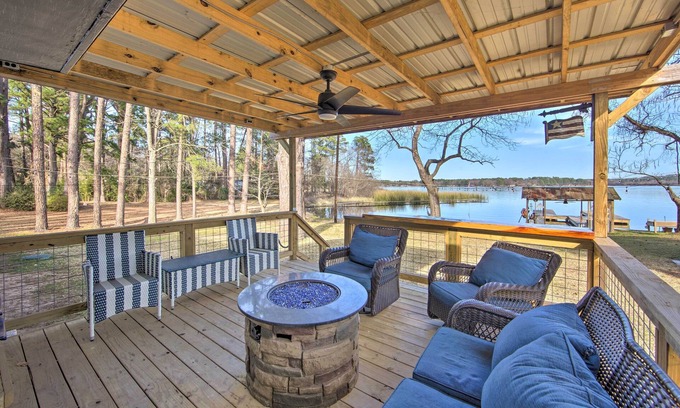 Your next lakefront vacation is just a click away! This 2-bedroom, 2-bath Daingerfield vacation rental is just steps from Lone Star Lake and is complete with a furnished deck, shared cabana, boat dock, and common areas. Enjoy days on the water with your boat or borrow one of the kayaks or paddle boats to float around the lake. At the end of the day, fire up the charcoal grill, then gather around the fire pit or cozy up on the outdoor couches while you enjoy the sounds of East Texas.
