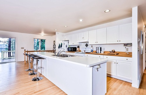 Cozy is the perfect word to describe this enchanting retreat. The living area invites you in with the warm crackling sound coming from the wood stove, plush seating is perfect for lounging and visiting amongst, the well-equipped kitchen awaits tasty creations to be concocted, and the dining room table presents a beautiful view as you overlook the vast back deck and lake while enjoying your meals. Central air-conditioning, a private washer/dryer, and several TVs give you all of the comforts you crave when on a trip. Head out in the available canoe for a sunrise ride around the lake to start your day off right, and spend your evenings gathered around the firepit planning out the following day's adventures.