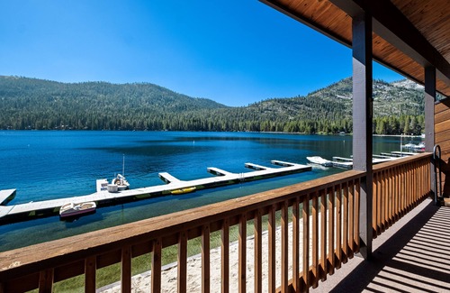 Off the living space a covered deck with adirondack chairs are waiting for you overlooking your private beach and the crystal clear water of Donner Lake. On the deck you have the entire length of the lake in view - simply breathtaking! The deck and private beach also offer an incredible front row seat to the Donner Lake 4th of July fireworks!
