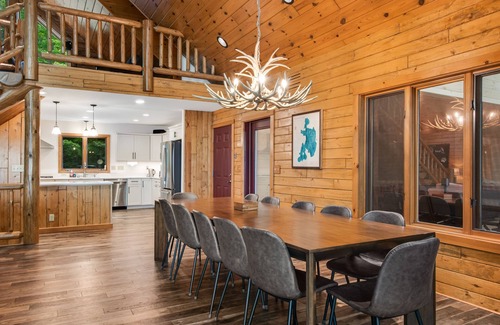 Bear Pause Retreat offers two kitchens. The main-floor kitchen is equipped for gourmet stylings with exquisite counters and deluxe stainless steel appliances, including two ovens, two sinks, a five-burner range, and a dishwasher. The first-floor kitchen has a stove/oven, fridge, and microwave for added convenience. Enjoy happy hour entertainment in the downstairs game room equipped with a pool table, speakers, an eight-seater bar, sofa, and smart TV, or unwind in the main-floor great room featuring a smart TV and large sectional. A cozy corner fireplace anchors both spaces for added ambiance and wintertime warmth. The formal dining table sets the stage for group gatherings with seating for 12. The in-home gym off the basement living area has a weight set and treadmill for home fitness needs.