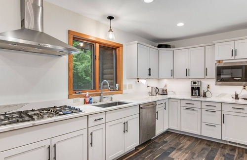 The Stone House exudes lakefront cabin charm with its stone exterior and designer interior. Create home-cooked meals in the well-equipped kitchen, then light the fireplace in the living area and stream your favorite TV show.