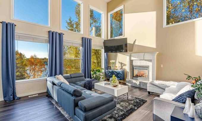 As you step inside, you`ll be greeted by high ceilings and floor-to-ceiling windows that frame the beautiful view of the lake. Warm up by the gas fireplace on chilly evenings and watch your favorite movies on the impressive 75” TV with Netflix, Hulu, & Disney+ subscriptions included.