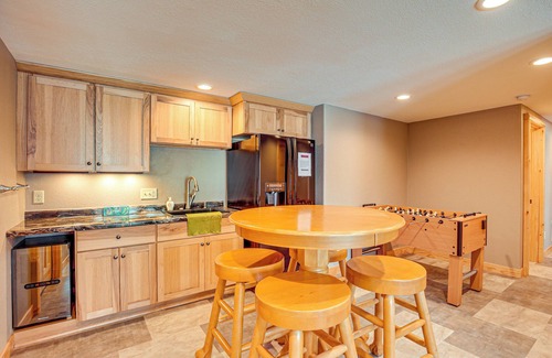 - Basement w/ 65" Smart TV, sectional sofa, kitchen area, wet bar w/ fridge, dining table & foosball table