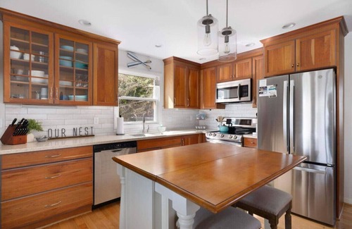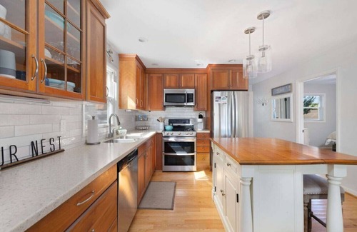 The main level features a primary bedroom with an en-suite bath and lake views, plus a second bedroom and nearby full bath. Upstairs, two cozy bedrooms share a full bath. Gather in the fully equipped kitchen or unwind in the living room with a smart TV and high-speed Wi-Fi.