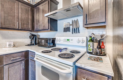 A fully stocked kitchen with an electric stove, dishwasher, coffee maker, crockpot, hot dog maker, and more
