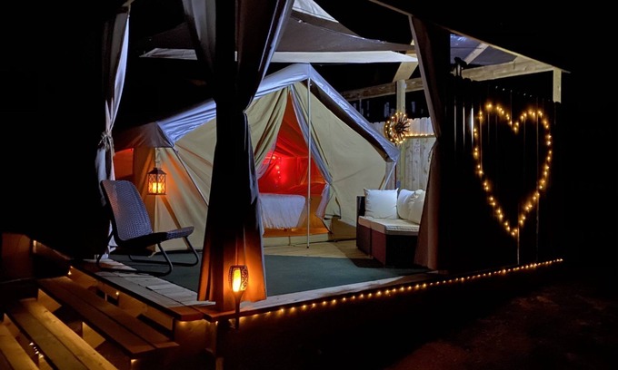 ***For the 2024 Solar Eclipse (April 6 - 10th) we are ONLY renting out our entire 5-acre 7-accommodation property.*** The "Love Shack" is our petite minimalist LAKEFRONT glamping tent that includes air conditioning, queen size bed, wifi, private deck, OUTDOOR shower, mini fridge, microwave, coffee maker, phone chargers, shared boat dock, shared pavilion access, peace, tranquility and relaxation! Private deck includes OUTDOOR hot water shower and outdoor seating on your private deck. It also has curtains to draw for more privacy – becoming a giant outdoor room! Private (very clean) portable toilet just a few feet from your deck. Again, this is a minimalist tent, but set on a very unique and beautiful retreat property.
