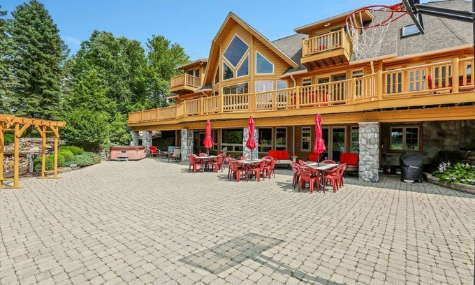 The wrap around main deck provides a large gas grill, bar height fire table, , numerous seating areas, patio tables, chairs and umbrellas. The brick paver patio provide guests with a 4 person hot tub and an outdoor basketball hoop. A stainless steel fire pit for a wood burning camp fire as well as a custom made benches and tables is located at the water front. Camp fire wood is provided for each night stay.
