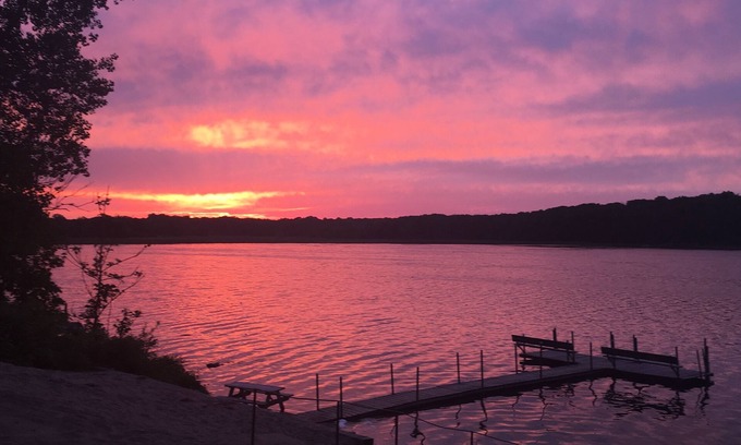 this private lakefront home nestled in the woods, has everything you need for the perfect family or friends getaway, with the fully equipped kitchen and large wrap around porch for your dining and entertaining pleasure, the back yard with its firepit and barbeque , just steps to the beach and pier, perfect for fishing , swimming or kayaking ,bring your back yard and beach toys and make memories of a lifetime.