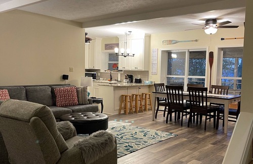 This spacious home is equipped with modern amenities to ensure your stay is comfortable and enjoyable. The main living area features a smart TV, perfect for relaxing after a day of wedding festivities. The well-appointed kitchen is stocked with everything you need to prepare meals, including a convection oven, air fryer, and utensils for up to eight guests. The outdoor areas include a charming screened porch and a stone patio with breathtaking lake views, ideal for hosting pre-wedding gatherings or post-ceremony celebrations. For those serene evenings, enjoy cozy fires with our SOLO Stove for roasting marshmallows and making memories around the firepit.