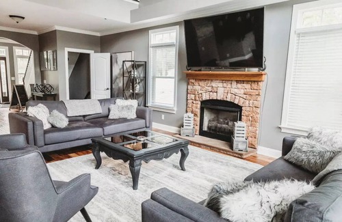 Modern Entertainment Options: Entertain guests in the finished basement featuring a game room, pool table, and four 75-inch HD TVs, perfect for keeping the fun going throughout your wedding stay.