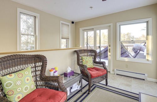 With beautiful views of Locke Lake, this 4-bed, 3.5-bath Barnstead home is the perfect winter escape! This vacation rental boasts multiple decks, a private hot tub, a boat dock, and a cozy fire pit by the water. When you’re not taking advantage of the outdoor amenities, stay warm indoors for a competitive game of ping-pong or gather by the fireplace!