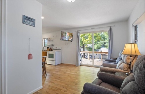 Inside, the home features two welcoming bedrooms, a fully equipped kitchen, and bright living spaces with lake views. It's an ideal layout for small families or couples, with everything needed for a comfortable stay, including easy dining prep, space to unwind, and cozy lakeview seating.