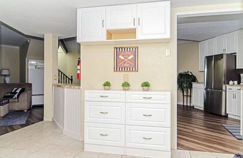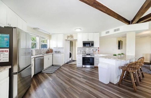 The kitchen is stocked with basic cooking supplies including, Keurig, Toaster, Microwave, Refrigerator, Oven, Utensils etc.