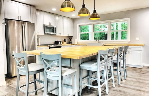 Beautiful year round waterfront home located on McGrath Pond accommodates up to 17 people. Air conditioned throughout, WIFI and Cable TV. Main level has open floor plan, family, dining area, bathroom, mudroom and fully equipped kitchen, elevated deck. Upstairs has master bedroom and bath, second bedroom with ensuite, third and fourth bedrooms with a shared full bath. Downstairs in-law suite has a bunk room, with 7 beds, large family room, and kitchenette with private entrance and patio. Washer and dryer located on main level. Front entry has covered porch and elevated deck overlooking the lake.