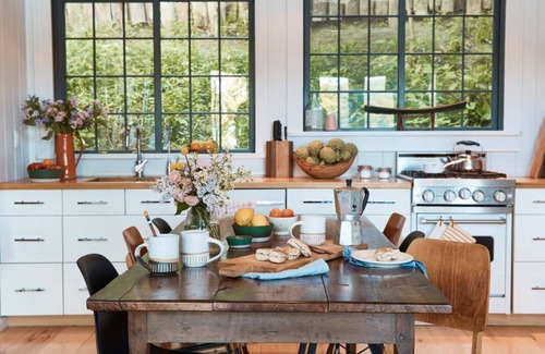 The Main House (2 bed, 2 bath, sleeps 6) is a renovated 1950s cottage blending charm and modern comfort: