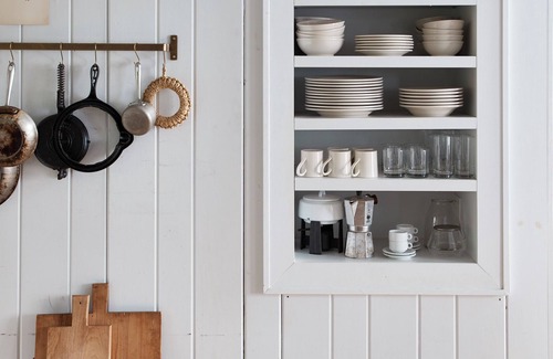 - Coffee station, under-counter fridge, dishware, and electric kettle