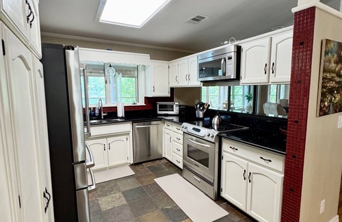 Upstairs is the well-appointed kitchen, equipped with everything you need to prepare meals, from a quick snack to a fantastic feast. Guests will also appreciate the additional downstairs kitchenette, adding extra flexibility for meal prep, storing drinks, or serving snacks.