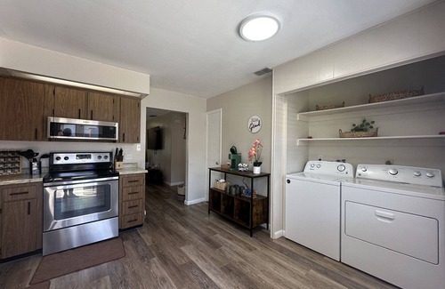 Our bathroom features vanity sink with mirror, toilet bowl, tub-shower combo and hair dryer. The washer and dryer are located near the kitchen. This home has Wi-Fi.
