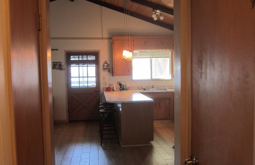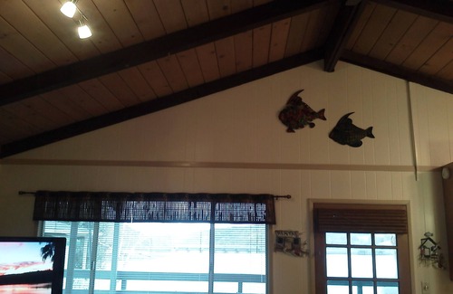 The house is light and bright. Large living room with open beam ceiling and picture window that boasts our beautiful lake and mountain views. Enjoy your coffee, or glass of wine next to the warming electric fireplace. There's a 42' Flat screen Tv and DVD player.